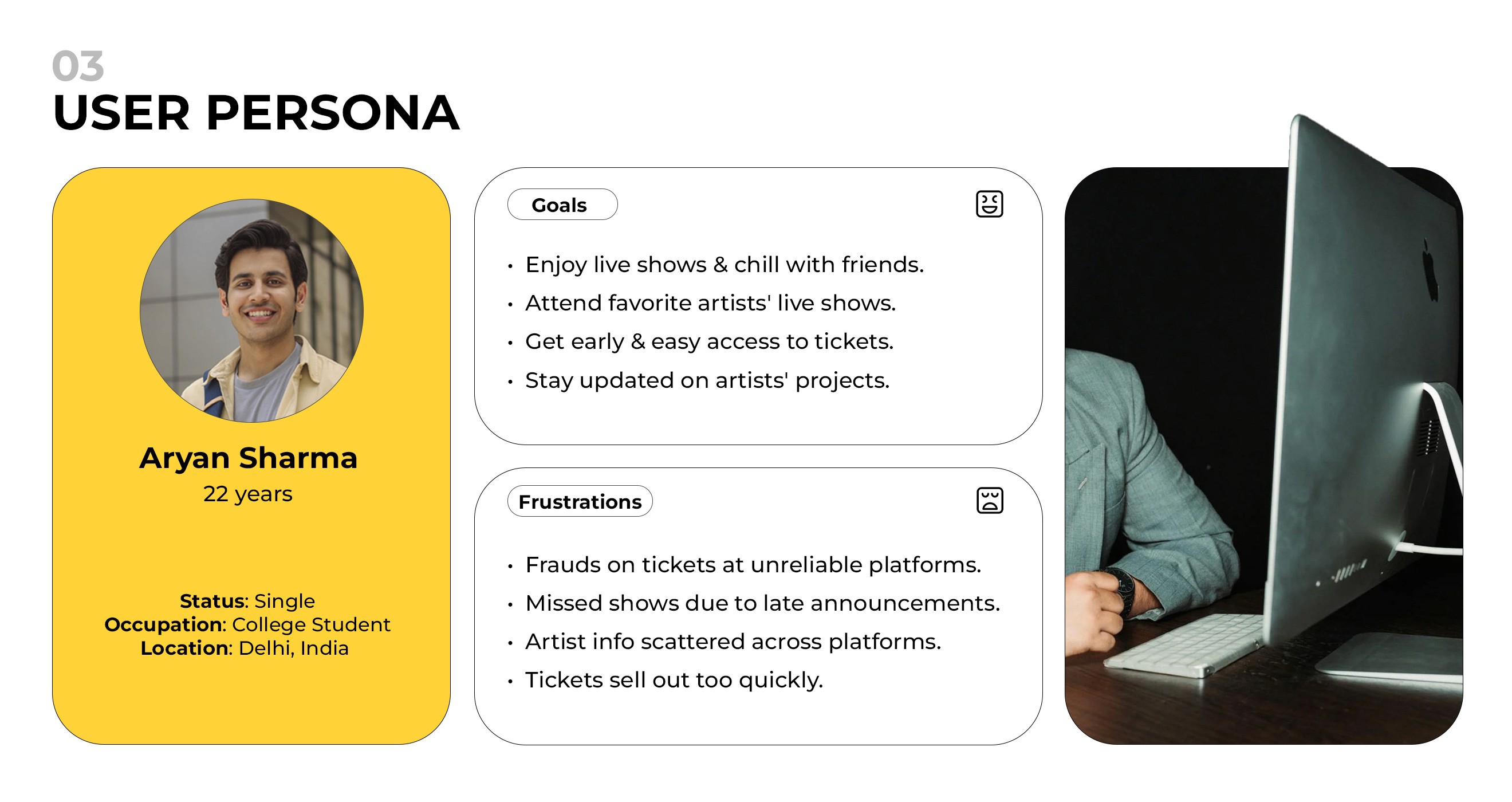 The project scope encompassed UX/UI design, logo animation, and a visual identity that reflect Zakir Khan’s unique persona. Through in-depth research and problem-solving, we crafted a platform to address the needs of his global fanbase, offering smooth live show bookings and an engaging space to explore his artistic journey.